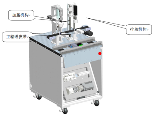接收上一工作站填裝好顆粒的瓶子,當瓶子被輸送到加蓋機構后,主輸送皮帶停止,夾蓋定位夾緊機構將瓶子固定,加蓋機構啟動加蓋流程,將蓋子加到瓶子上;加好蓋子后主輸送皮帶啟動,加上蓋子的瓶子繼續被送往擰蓋機構,到擰蓋機構下方,主輸送皮帶停止,擰蓋定位夾緊機構將瓶子固定,擰蓋機構啟動,將瓶蓋擰緊,主輸送皮帶啟動,將擰好蓋子的物料瓶輸送到下一工位。瓶蓋分為白色和黑色兩種。