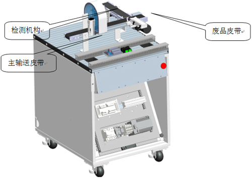 主皮帶運行,接收上一站擰好蓋后的物料瓶子,當物料瓶經過檢測機構時:回歸反射傳感器檢測瓶蓋是否擰緊;檢測機構檢測瓶子內部顆粒是否符合要求;對擰蓋與顆粒均合格的瓶子進行瓶蓋顏色判別區分;擰蓋或顆粒不合格的瓶子被分揀機構推送到廢品皮帶上(短皮帶);擰蓋與顆粒均合格的瓶子被輸送到皮帶末端,等待機器人搬運。