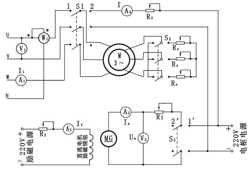 (1)按圖4-2接線,圖中M用編號為DQ11的三相線繞式異步電動機,UN=220V,Y接法。MG用編號為DQ19的校正直流測功機。S1、S2、S3選用DQ31C上的對應開關,并將S1合向左邊1端,S2合在左邊短接端(即線繞式電機轉子短路),S3合在2'位置。R1選用DQ29的180Ω阻值加上DQ27上四只900Ω串聯再加兩只900Ω并聯共4230Ω阻值,R2選用DQ29上1800Ω阻值,RS選用GDQ12上35Ω阻值,R3暫不接。直流電表A2、A4的量程為5A,A3量程為200mA,V2的量程為300V,交流電壓表V1的量程為300V,A1量程為3A。