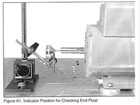 F. 將百分表的探針放在接近電機安裝螺栓的位置上,如圖73所示,將指針調零,調整百分表使得它的探針與支撐墊塊接近垂直,如圖所示,盡量接近90度。