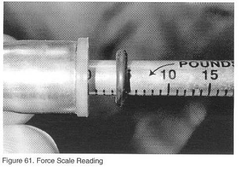 G. 將張力測試儀從帶上取下并且讀出力刻度線上的讀數,如圖61所示;
