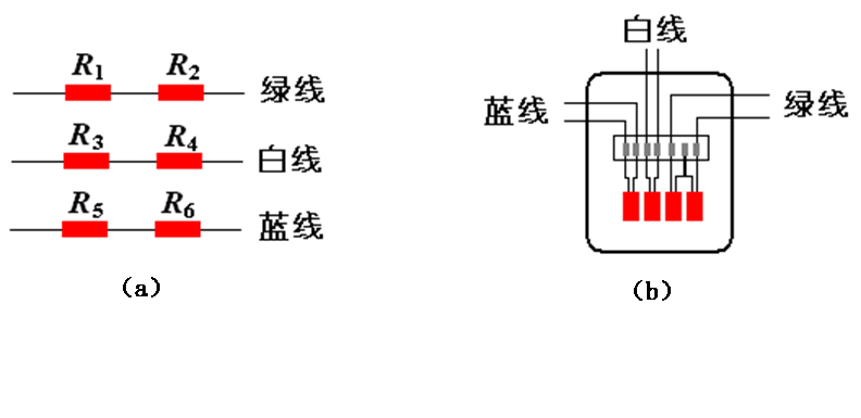 試件上的貼片情況(見圖5-4),其中對應正反面的應變片已兩兩串聯連接。另有一補償塊,補償塊上共粘貼了四片應變片,其中綠色線為兩片應變片串聯連接線。