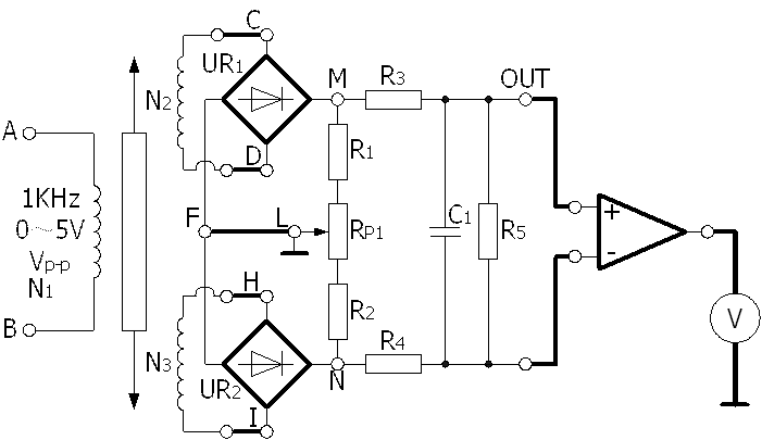 傳感器的兩個次級線圈(N2、N3)電壓分別經UR1、UR2兩組橋式整流電路變換為直流電壓,然后相減,經過差動放大器放大后,由電壓表顯示出來。R1、R2為兩橋臂電阻,RP1為調零電位器,R3、R4、C1組成濾波電路,R5為負載電阻,采用這種差動整流電路可以減少零點殘余電壓。