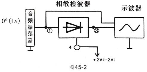 2、根據圖49-2的電路接一,將音頻振蕩器的信號0°輸出端輸出至相敏檢波器輸入端①,把直流穩壓電源+2V輸出接至相敏檢波器的參考輸入端④把示波器兩根輸入線分別接至相敏檢波器的輸入端①和輸出端③組成一個測量線路。