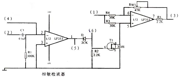 當②或④端輸入控制電壓信號時,通過開環放大器的作用使場效應晶體管處于開關狀態。從而把①端輸入的正弦信號轉撳與控制信號有關的檢波信號。