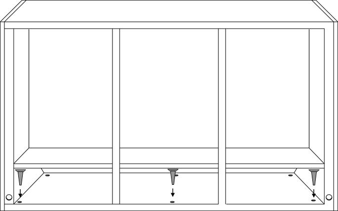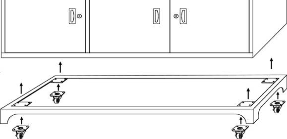② 將桌體翻轉(zhuǎn),圍板與萬向輪一同安裝到實驗臺桌身,注意孔位對齊。按照右圖所示