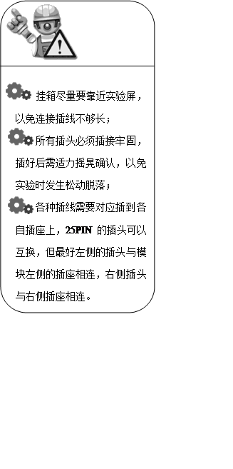 8、 模塊安放到實驗機頭上。將①中已經(jīng)連接好的實驗插線整理好,將長出的部分合理放入機頭內(nèi)側(cè),以免模塊掛上時壓住插線。