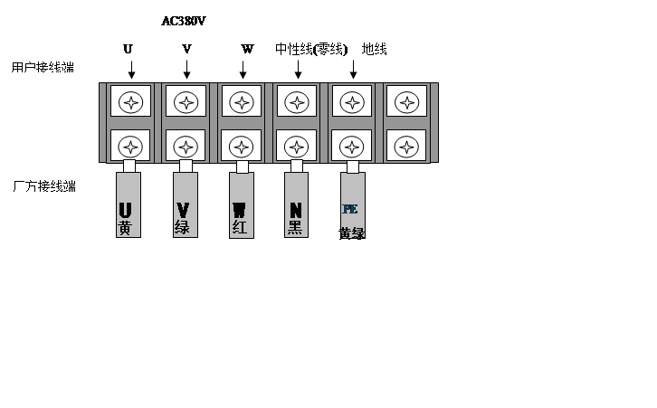 用一條5芯護(hù)套線作為電源線,每條線芯不得低于1mm2。按照圖的順序引入電源線。電源線另一頭可以選用公司配方的三相插頭,但地線(PE)需要單獨接地。