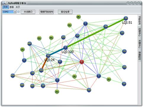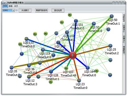 典型的 ZigBee 網絡如圖 1.1 與圖 1.2 所示。圖截取自我司可視化 ZigBee 實時控制調試工具。 ZigBee 網絡是一種小數據量的無線射頻網絡,由非休眠的主機(CO)、路由(RO)與休眠的終端(EN) 節點構成,圖中分別由紅、藍、綠色點表示。網絡有如下特點: