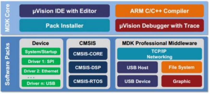 MDK 源自德國的 KEIL 公司,是 RealView MDK 的簡稱。在全球 MDK 被超過 10 萬的嵌入式開發工程師使用。目前最新版本為:MDK5.14,該版本使用 uVision5 IDE 集成開發環境,是目前針對 ARM 處理器,尤其是 Cortex M 內核處理器的最佳開發工具。MDK5 向后兼容 MDK4 和 MDK3 等,以前的項目同樣可以在 MDK5 上進行開發(但是頭文件方面得全部自己添加), MDK5 同時加強了針對 Cortex-M 微控制器開發的支持,并且對傳統的開發模式和界面進行升級,MDK5 由兩個部分組成:MDK Core 和 Software Packs。其中,Software Packs 可以獨立于工具鏈進行新芯片支持和中間庫的升級。如下圖所示。