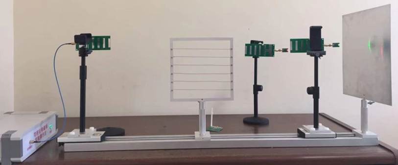 隨時變化的電場在空間產生磁場,同樣,隨時間變化的磁場也要在空間產生電場,電場和磁場構成統一的電磁場的兩個不可分割的部分。能夠輻射電磁波的裝置稱為天線,用功率信號發射器作為發射源,通過發射天線產生電磁波,如果將另一副天線置于電磁波中,就能夠在天線體上感生高頻電流,接收天線離發射天線越近,電磁波功率越強,感應電動勢越大。接收天線接收的功率足夠強時,大于5dBm時,肖特基檢波二極管將微波能量轉變為直流電壓,終端接上LED燈,電壓達到一定值時可以點亮LED燈,形象直觀的觀察發射天線的方向圖、主瓣、副瓣、后瓣、零點方向、極化等。放大頻率范圍:2350MHz~2450MHz最大輸出功率27dBm,發射天線有四種類型,垂直極化、水平極化、左旋圓極化、右旋圓極化;增益:>10dBi,在現有配置情況下,最遠可以在170cm處點亮,距離越近燈越亮。也可以將不同的LED組合使用,但點亮距離會稍微減小。