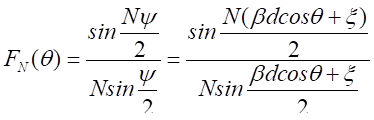 天線陣的總輻射場(chǎng)等于位于原點(diǎn)的陣單元輻射的場(chǎng)乘上一個(gè)因子,這個(gè)因子的出現(xiàn)是由兩個(gè)電流元排列成天線陣而出現(xiàn)的,稱(chēng)陣因子。歸一化陣因子方向圖函數(shù)可以表示為: