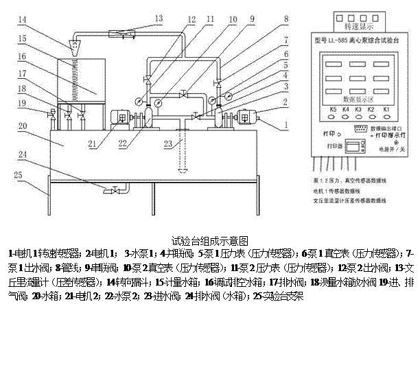 實驗裝置由兩臺離心泵綜合試驗臺和兩臺計算機組成。試驗臺的組成及設備如下圖所示: