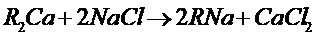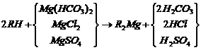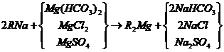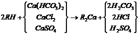 當含有鈣鹽及鎂鹽的水通過裝有陽離子交換樹脂的交換器時,水中的Ca2+及Mg2+便與樹脂中的可交換離子(Na+或H+)交換,使水中Ca2+、 Mg2+含量降低或基本上全部去除,這個過程叫做水的軟化。樹脂失效后要進行再生,即把樹脂上吸附的鈣、鎂離子置換出來,代之以新的可交換離子。鈉離子交換用食鹽(NaCl)再生、氫離子交換用鹽酸(HCl)或硫酸(H2SO4)再生。基本反應式如下。
