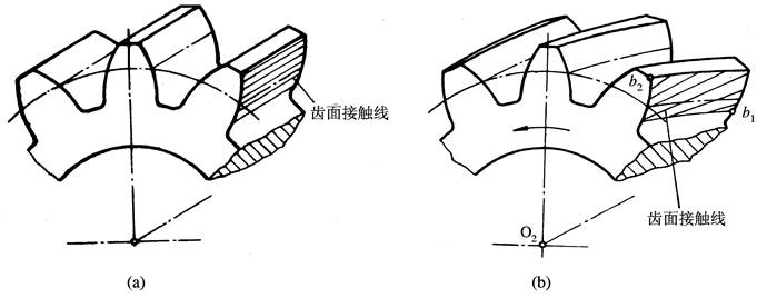 直齒圓柱齒輪嚙合時(shí),輪齒接觸線(xiàn)是一條平行于軸線(xiàn)的直線(xiàn),并沿齒面移動(dòng),如圖4-1(a)所示。 所以在傳動(dòng)過(guò)程中,兩輪齒將沿著整個(gè)齒寬同時(shí)進(jìn)入嚙合或同時(shí)退出嚙合,因而輪齒上所受載荷也是突然加上或突然卸下, 傳動(dòng)平穩(wěn)性差,易產(chǎn)生沖擊和噪聲。