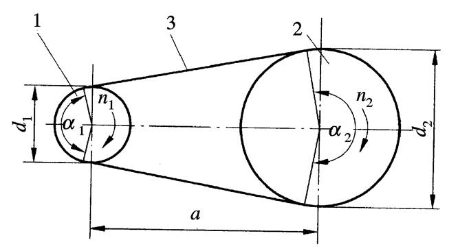 摩擦型帶傳動通常由主動輪、從動輪和傳動帶組成。傳動帶以一定的初拉力F0緊套在帶輪上,在F0的作用下,帶與帶輪的接觸面間產生正壓力,當主動輪1回轉時,接觸面間產生摩擦力,主動輪靠摩擦力使傳動帶3與其一起運動。同時,傳動帶靠摩擦力驅使從動輪2與其一起轉動,從而主動軸上的運動和動力通過傳動帶傳遞給了從動軸。