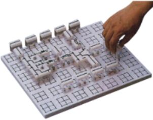 實驗桌一桌兩座,實驗桌中央配有通用九孔萬能插件板(尺寸:35×90cm ),九孔萬能插件板主體由ABS注塑而成,表面布有九孔成一組相互聯通的插孔,九孔萬能插件板內部內嵌126組銅質九孔一體成型嵌件(共有1134孔)。實驗中的弱電模塊必須以獨立封裝的透明元件盒為單一模塊,元件盒統一都能配合九孔萬能插件板像搭積木一樣的形式自由搭建組合電路;元件盒盒體透明,內裝元件直觀性好,盒蓋印刷電路圖防刮耐磨,符號美觀清晰。元件盒盒體與盒蓋采用較科學的壓卡式結構,維修拆裝方便。每張臺桌配有一粒膠皮板,保護通用底板與桌面(如需在桌上放置電動機、焊接等)。