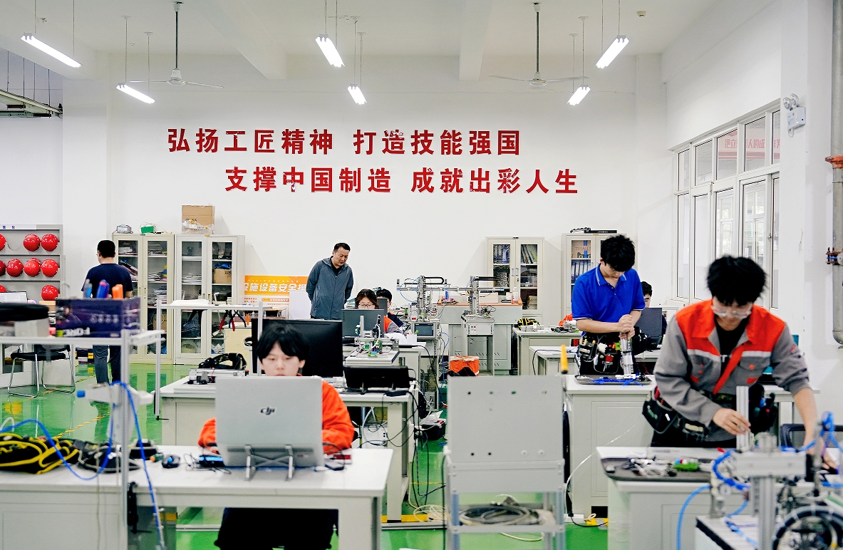 在工業機器人虛擬仿真實訓基地內,學生可在1:1復現的企業生產線環境中實訓。該校黨委書記張林介紹,學校先后與500余家龍頭企業開展校企合作產教融合,現有現代學徒制、現場工程師、訂單式培養(冠名班)260余個,教師企業實踐流動站21個,校外實訓基地360余個。