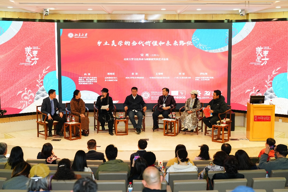 在主題對話環節,嘉賓們圍繞三個不同的議題展開對話。議題一聚焦“鄉土美學的當代價值與未來創新路徑”,由北京大學文化傳承與創新研究院藝術總監宋亮主持。向勇闡述了文化產業研究院在鄉土美學方面的發展方向。山西剪紙傳承人、鄉土繪畫藝術家郭梅花結合自身創作,提倡藝術與生活相結合。四川大學藝術學院教授彭肜則強調了守護傳統與鄉土的價值。中國美術館民間美術主任王雪峰,廣西三江縣文聯主席榮任,中國藝術報社項目策劃、作家、文藝評論家伊紅梅就鄉土繪畫的當代傳承與轉化問題發表了各自的洞見。