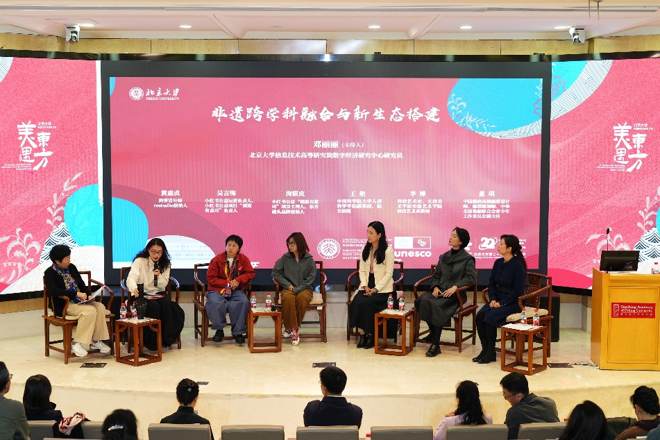 議題三圍繞“非遺跨學科融合與新生態搭建”展開,北京大學信息技術高等研究院數字經濟研究中心研究員鄧麗麗主持對話。跨界設計師、restudio創始人黃惠貞,小紅書公益項目“創造有意司”主理人、東方碰頭品牌創始人海蜇皮,小紅書公益運營負責人、小紅書公益項目“創造有意司”負責人吳言悔分享了各自的實踐心得。中國科學院大學人居科學學院副教授、院長助理王艷分享了通過科學賦能非遺創新、開設跨學科實踐課程的思考。科技藝術家、天津美術學院實驗藝術學院科技藝術系教師李博介紹了非遺科技藝術作品。中國郵政高級郵票設計師、郵票雕刻師、中華全國集郵聯合會青少年工作委員會副主任董琪以“郵票上的非遺”為題,解讀了郵票藝術的非遺魅力。